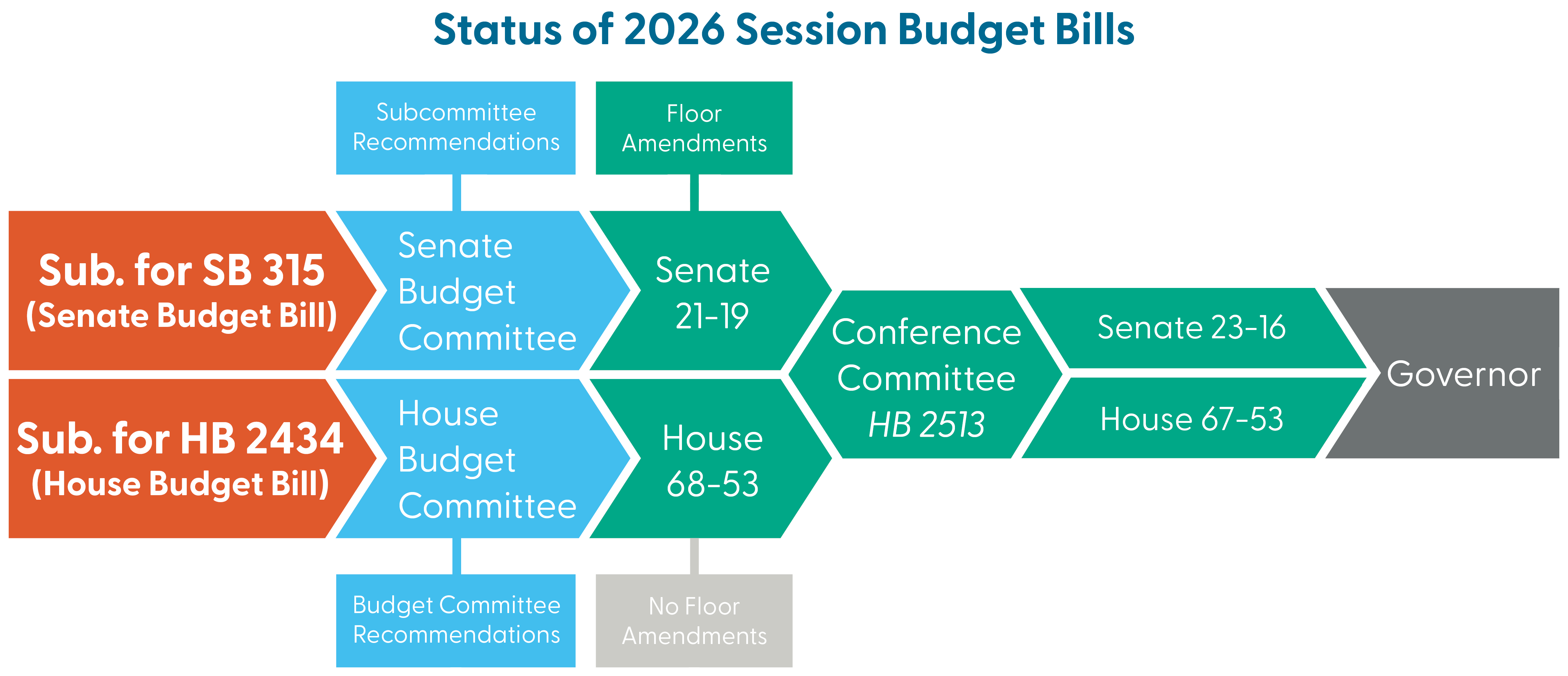 - Line items in HB 2513, the state budget plan. The budget package received a Senate vote of 23-16 and a House vote of 67-53.