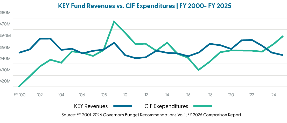 Second, between 2001 and 2018, more than $235 million was transferred out of the KEY Fund and CIF to cover shortfalls in the State General Fund (SGF). This misuse affected programmatic funding in those particular years and hindered the effort to create a self-sustaining endowment that would grow with time.