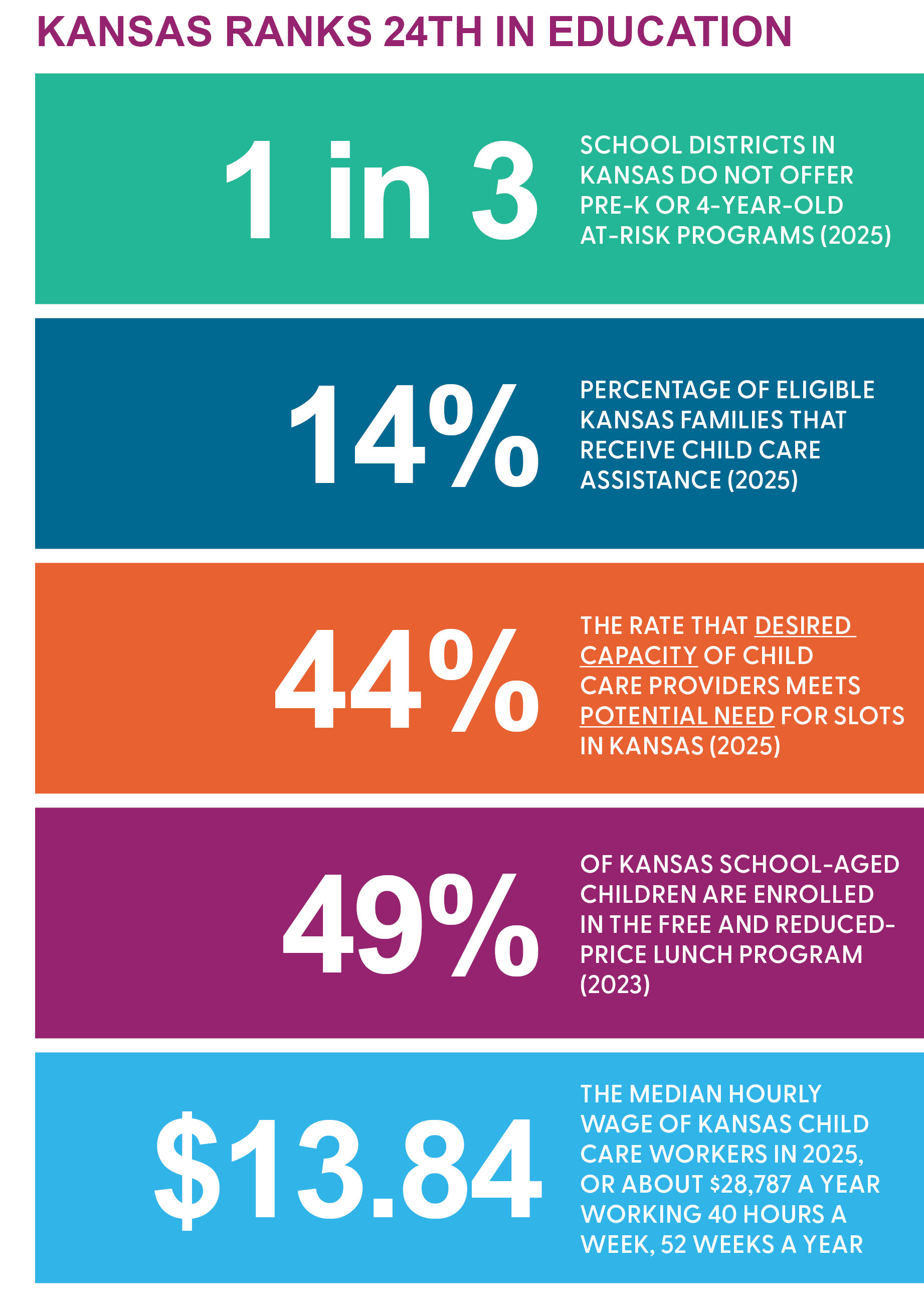 Despite the importance of early learning opportunities, many Kansas families are unable to afford or access quality, nurturing care due to cost barriers. These barriers prevent some parents from entering the workforce and attaining a stable, healthy life.