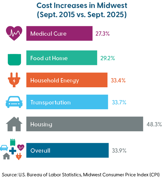 According to the U.S. Department of Agriculture, the cost to raise a child born in 2015 was approximately $233,600. Adjusted for inflation, this suggests the cost to raise a child born in 2025 from birth through age 17 is nearly $320,000. Since September 2015, costs in the Midwest have risen 33.9%, and the cost of living remains the top concern for many families.