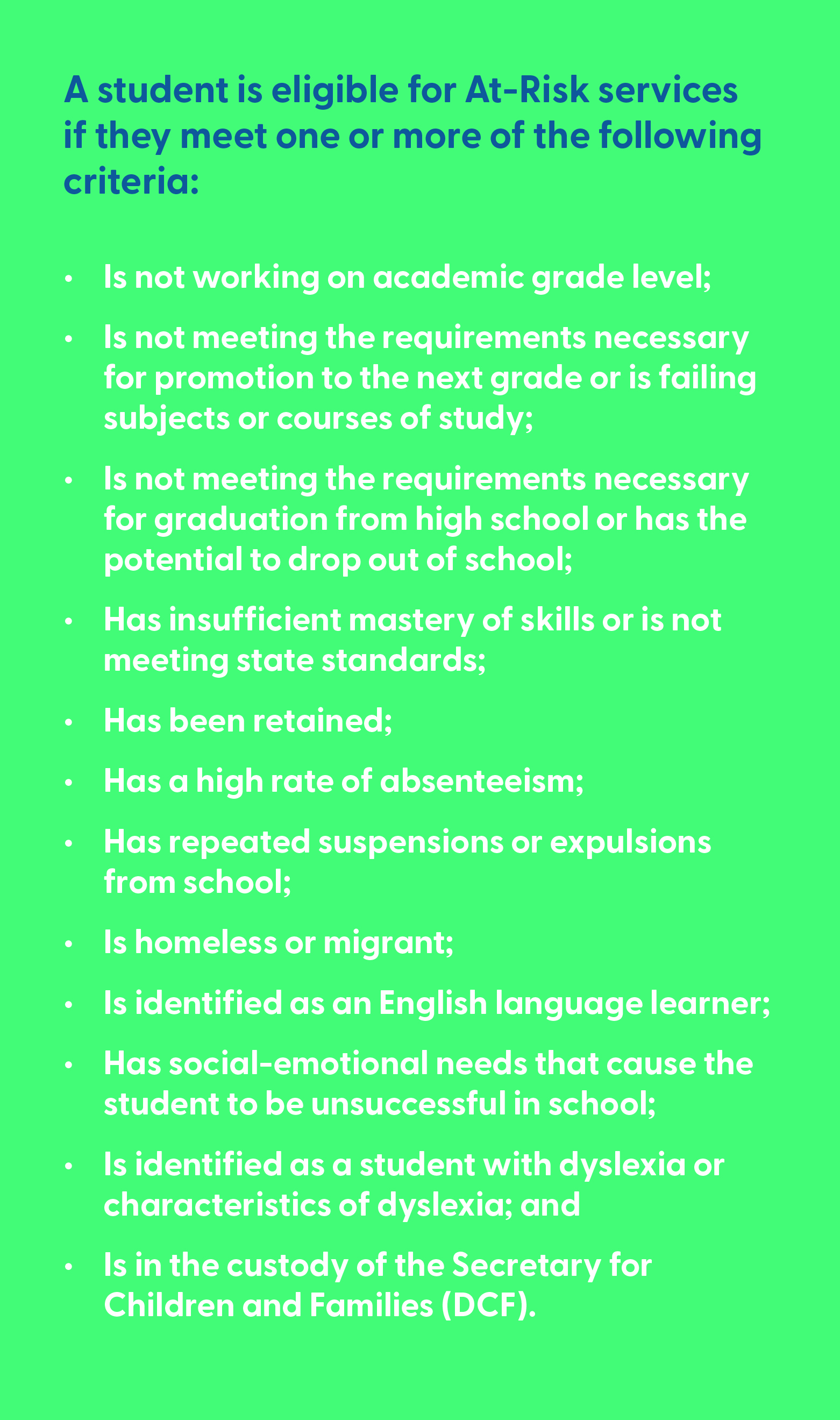 Beginning in the 2030-2031 school year, if after five years of this process a district fails to achieve the academic goal, they will not be entitled to the full amount of state aid that would have been allocated for At-Risk Student weighting and High Density At-Risk weighting.