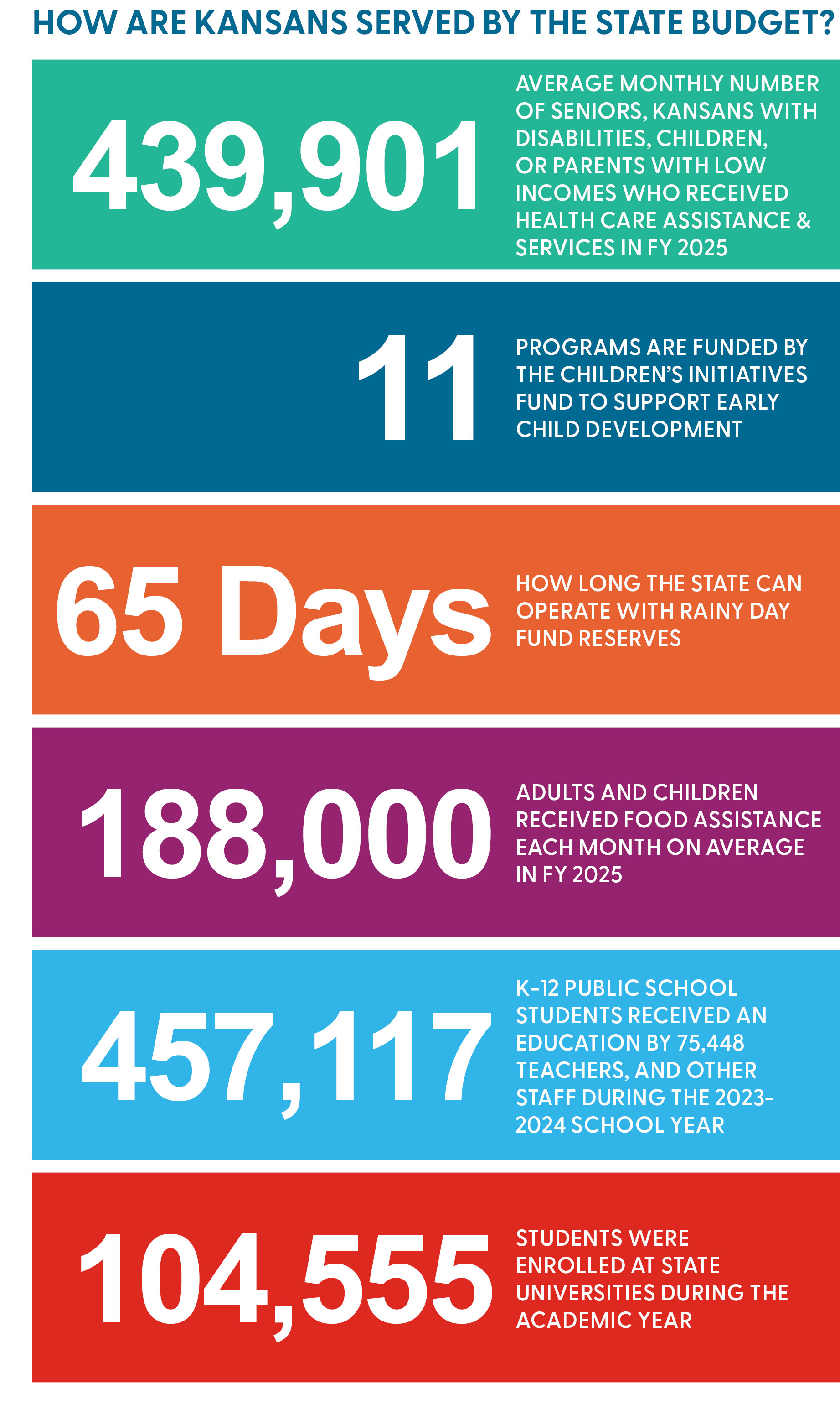 THE STATE BUDGET IS MORE THAN DOLLARS AND CENTS. It reflects the values of Kansas voters and the lawmakers elected to represent them. Decisions to spend taxpayer dollars on programs and services vital to children, families, and communities matter because the budget determines our state’s quality of life, including economic security, education, health care, and much more.
