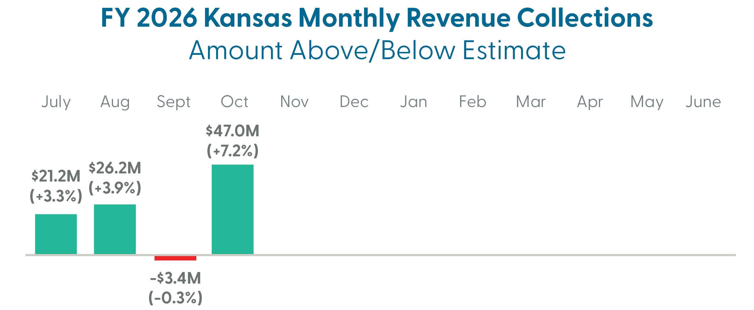 While individual income taxes make up a larger portion of collections than corporate income, it is notable that corporate income tax collections have fallen well below estimates in each month of FY 2026. To date, corporate income tax collections have fallen $77.7 million below expectations, while individual collections have exceeded expectations by $142.4 million.